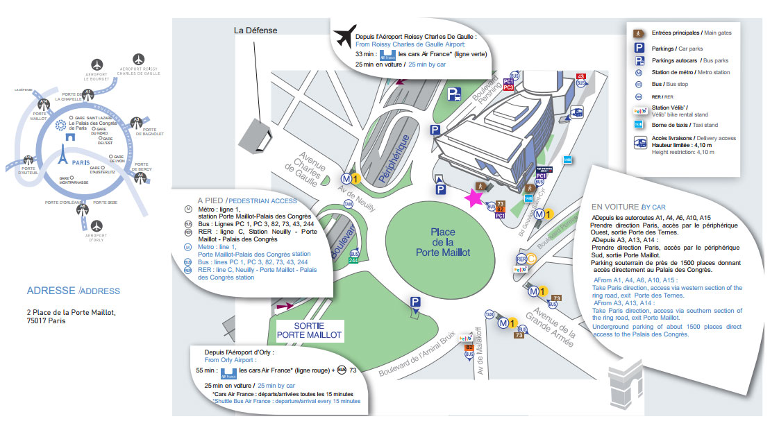 The Palais des Congrès is easily accessible by metro or RER, from Metro Ligne 1 Station Porte Maillot or RER C Station Porte Maillot-Palais des Congrès. A few bus stops also surround the venue for bus lines: PC 1, PC 3 and 43, 73, 82, 244. For those who prefer cycling, a velib’ station can be found within easy reach, on Place de la Porte Maillot.